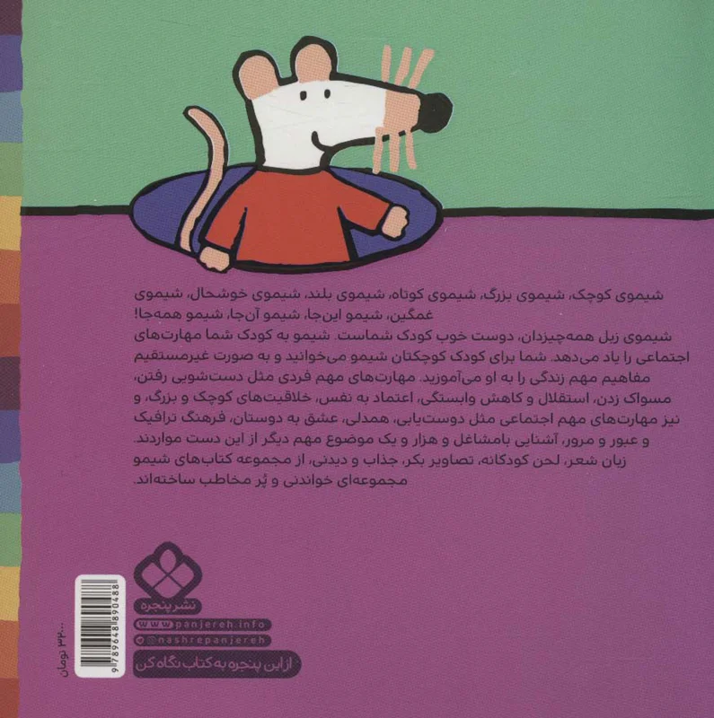 شیموی کوچک،شیموی بزرگ،شیموی کوتاه،شیموی بلند،شیموی خوشحال،شیموی غمگین،شیمو این جا،شیمو آن جا،شیمو همه جا،شیموی زبل همه چیز دان،دوست خوب کودک شماست.شیمو به کودک شما مهارت های اجتماعی را یاد می دهد.شما برای کودک کوچکتان شیمو می خوانید و به صورت غیر مستقیم مفاهیم مهم زندگی را به او می آموزید.مهارت های مهم فردی مثل دست شویی رفتن ،مسواک زدن،استقلال و کاهش وابستگی،اعتماد به نفس،خلاقیتهای کوچک و بزرگ،و نیز مهارت های مهم اجتماعی مثل دوست یابی،همدلی،عشق به دوستان،فرهنگ ترافیک و عبور و مرور ،آشنایی با مشاغل و هزار و یک موضوع مهم دیگر از این دست مواردند.زبان شعر،لحن کودکانه ،تصاویر بکر،جذاب و دیدنی،از مجموعه کتاب های شیمو مجموعه ای خواندنی و پرمخاطب ساخته اند .