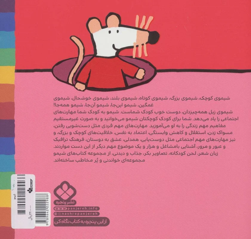 شیموی کوچک،شیموی بزرگ،شیموی کوتاه،شیموی بلند،شیموی خوشحال،شیموی غمگین،شیمو این جا،شیمو آن جا،شیمو همه جا،شیموی زبل همه چیز دان،دوست خوب کودک شماست.شیمو به کودک شما مهارت های اجتماعی را یاد می دهد.شما برای کودک کوچکتان شیمو می خوانید و به صورت غیر مستقیم مفاهیم مهم زندگی را به او می آموزید.مهارت های مهم فردی مثل دست شویی رفتن ،مسواک زدن،استقلال و کاهش وابستگی،اعتماد به نفس،خلاقیتهای کوچک و بزرگ،و نیز مهارت های مهم اجتماعی مثل دوست یابی،همدلی،عشق به دوستان،فرهنگ ترافیک و عبور و مرور ،آشنایی با مشاغل و هزار و یک موضوع مهم دیگر از این دست مواردند.زبان شعر،لحن کودکانه ،تصاویر بکر،جذاب و دیدنی،از مجموعه کتاب های شیمو مجموعه ای خواندنی و پرمخاطب ساخته اند .