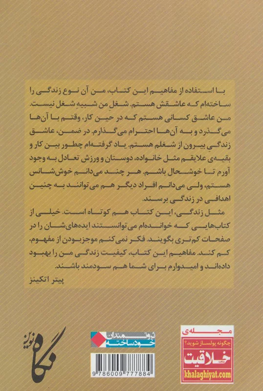 با استفاده از مفاهیم این کتاب، من آن نوع زندگی راساخته ام که عاشقش هستم،شغل من شبیه شغل نیست.من عاشق کسانی هستم که در حین کار،وقتم با آنها میگذرد و به آنها احترام میگذارم. در ضمن،عاشق زندگی بیرون از شغلم هستم. یاد گرفته ام چطور بین کار و بقیه ی علایقم مثل خانواده،دوستان و ورزش تعادل به وجود آورم تا خوشحال باشم. هرچند میدانم خوش شانس هستم،ولی میدانم افراد دیگر هم میتوانند به چنین اهدافی در زندگی برسند. مثل زندگی،این کتاب هم کوتاه است. خیلی ازکتابهایی که خوانده ام می توانستند ایده هایشان را درصفحات کمتری بگویند و فکر نمیکنم موجز بودن از مفهوم،کم کند.مفاهیم این کتاب،کیفیت زندگی من را بهبود داده اند و امیدوارم برای شما هم سودمند باشند.