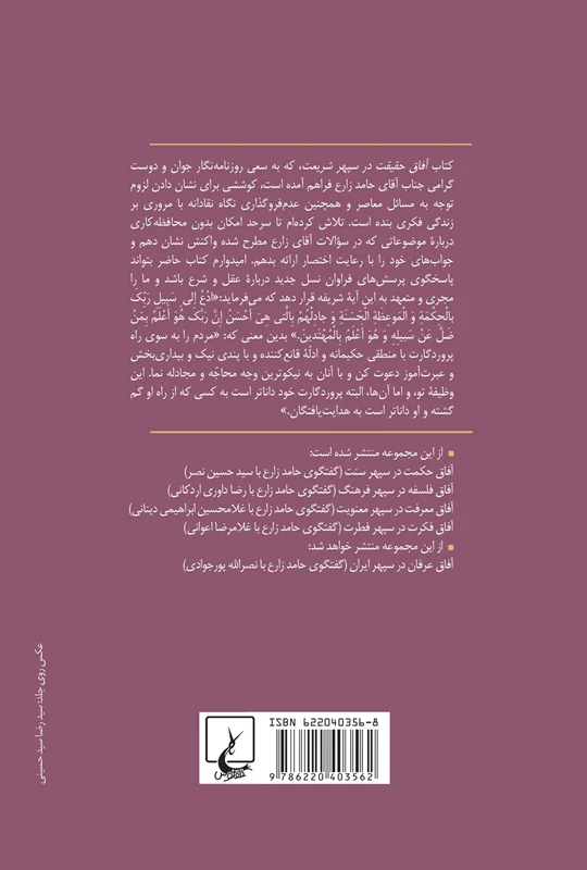 کتاب آفاق حقیقت در سپهر شریعت، که به سعی روزنامه نگار جوان جناب آقای حامد زارع فراهم آمده است، کوششی برای نشان دادن لزوم توجه به مسائل معاصر و همچنین عدم فروگذاری نگاه نقادانه با مروری بر زندگی فکری سید محقق داماد است. ایشان تلاش کردند تا سر حد امکان بدون محافظه کاری دربارۀ موضوعاتی که در سوالات آقای زارع مطرح شده واکنش نشان دهند و جواب های خود را با رعایت اختصار ارائه بدهند. کتاب حاضر سعی داشته پاسخگوی پرسش های فراوان نسل جدید دربارۀ عقل و شرع باشد.