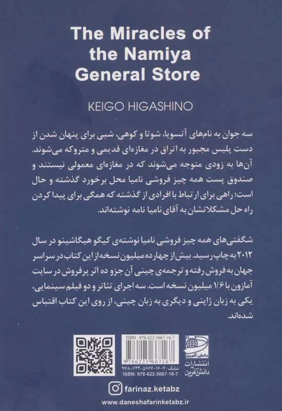 شگفتیهای همه چیز فروشی نامیا نوشتهی کیگو هیگاشینو در سال 2012 به چاپ رسید. بیش از چهارده میلیون نسخه از این کتاب در سراسر جهان به فروش رفته و ترجمهی چینی آن جزو ده اثر پرفروش در سایت آمازون با 1.6 میلیون نسخه است. سه اجرای تئاتر و دو فیلم سینمایی، یکی به زبان ژاپنی و دیگری به زبان چینی، از روی این کتاب اقتباس شدهاند.