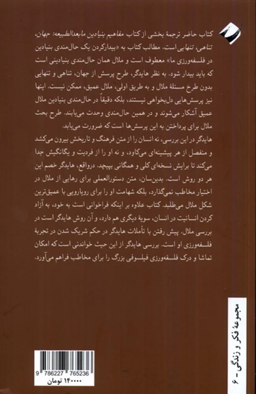 مارتین هایدگر پس از انتشار یکی از سترگترین آثار فلسفی تاریخ بشر، یعنی کتاب «هستی و زمان»، سلسله سخنرانیهایی را در سالهای 1920 تا 1930 ایراد کرد. پس از این، سخنرانیهای وی بهچاپ در آمدند و حاصل آنها شد کتاب «مفاهیم بنیادین مابعدالطبیعیه: جهان، تناهی و تنهایی». کتاب «ملال»، ترجمۀ بخشی از آن به فارسی توسط مریم هاشمیان است.