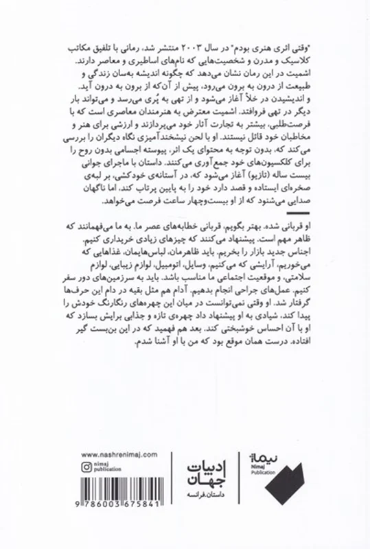 زمانی که یک اثر هنری بودم، رمانی است به قلم اریک امانوئل اشمیت، نویسنده ی محبوب معاصر که داستان های معروفی با زمینه ی دراماتیک به جهان عرضه داشته است. این رمان داستان مردی است جوان که انسانیت خود را به یک هنرمند واگذار ساخته و هنرمند، مرد جوان قصه را به یک اثر هنری تبدیل می کند. رمان که ابتدا در سال دو هزار و دو به زبان فرانسوی منتشر شد، چهلمین رمان اریک امانوئل اشمیت بوده و بر اساس داستان فاوست از گوته به نگارش در آمده است.
