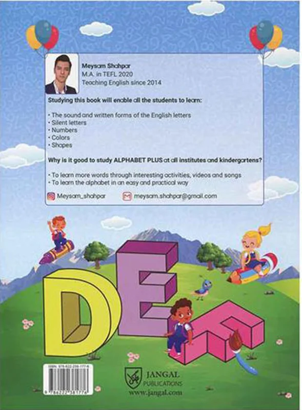 بعلاوه، هنگام آموزش الفبای انگلیسی به پیش دبستانیها، چند عامل باید در نظر گرفته شوند، بدین صورت، (الف) خواندن الفبا، (ب) شناسایی و مطابقت حروف بزرگ و کوچک، (ج) شناخت اصواتی که هر حرفی ایجاد میکند، و (د) ترسیم و نوشتن حروف. در این کتاب، نویسنده تمایل دارد تا تجربه خودش در زمینهی آموزش الفبای انگلیسی به کودکان را با شما به اشتراک بگذارد. هر یک از حروف، با استفاده از روشهای نوین، آموزش داده میشود- یعنی، از طریق آوای آن. سپس، سبک نوشتاری( یا ترسیم) آن با فلشهایی نشان داده میشود. علاوه بر این، مثالهای مختلفی هم برای هر حرفی ارائه میشوند. برای درک بهتر، انواع فعالیتهای جالب هم در کتاب معرفی می شوند. لازم به ذکر است که الفبای آوایی، مصوتها، حروف صامت، اعداد، رنگها و اشکال هم در این کتاب آمدهاند. برای اینکه خوانندگان، این موارد را بهتر یاد بگیرند و گوش دهند، همهی درسها همراه با فایل صوتی بصورت یک سی دی همراه کتاب است